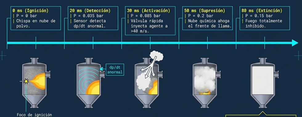 - Supresión (Activo): es la única opción viable cuando manejamos productos tóxicos o instalaciones interiores donde ventilar una llamarada al entorno es inaceptable. El sistema detecta la presión incipiente en apenas 20 ms y dispara agentes extintores a 61 m/s. Esta velocidad es la clave: el agente debe adelantar al frente de llama para neutralizarlo antes de que alcance el pico de presión.